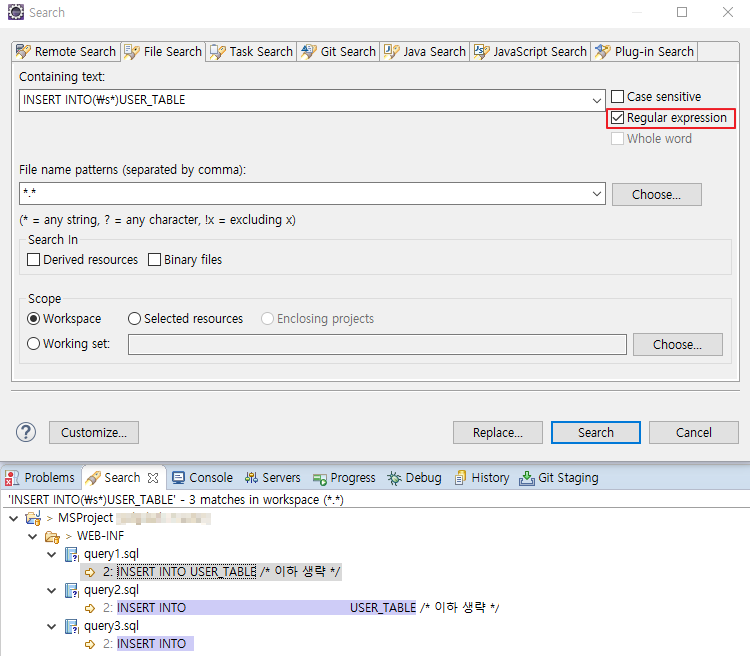 이클립스 Search > File 창에서 File Search 탭의 Regular expression에 체크 후 창을 닫은 후