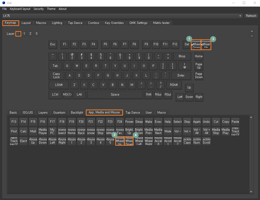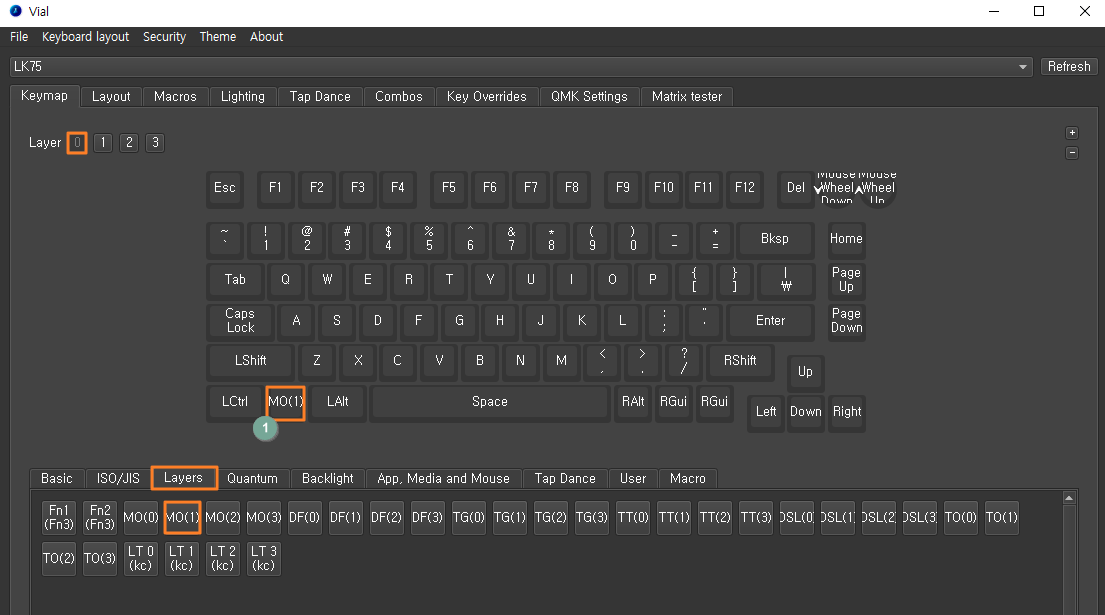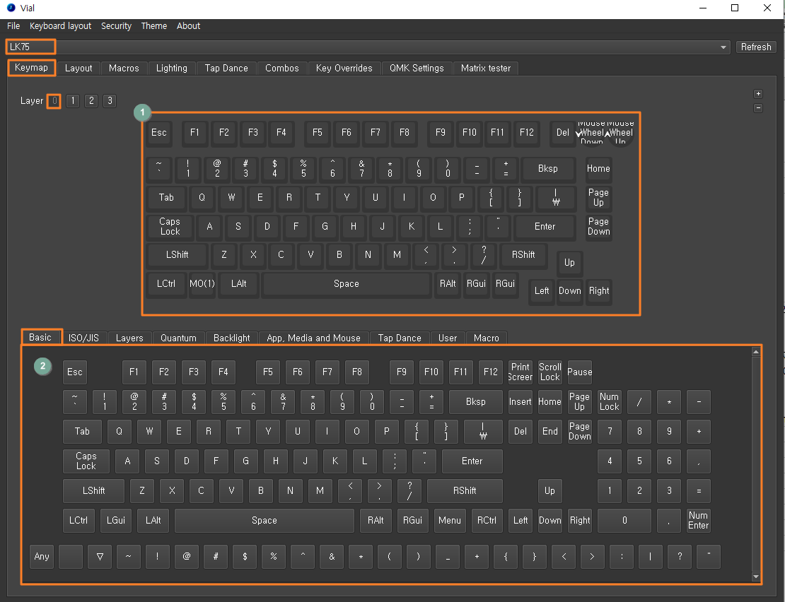 루민키75 키보드를 사용중이면 LK75라고 표시되어야 정상적으로 키보드 매핑이된 것이다.