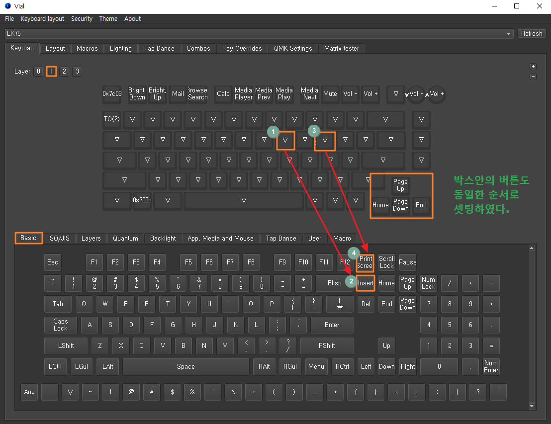 <Fn + Key 조합으로 Insert, PrintScreen, PageUp, PageDown, Home, End 버튼을 셋팅>