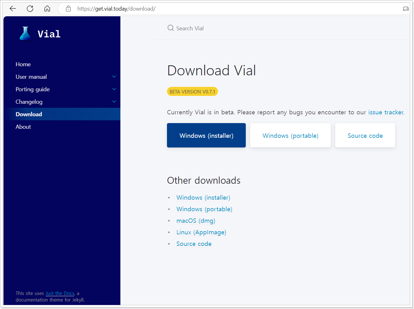 2. vial 사이트 링크(아래 사이트에 접속하여 별도 파일다운로드 설치없이 곧바로 키보드 매핑이 가능하다.)